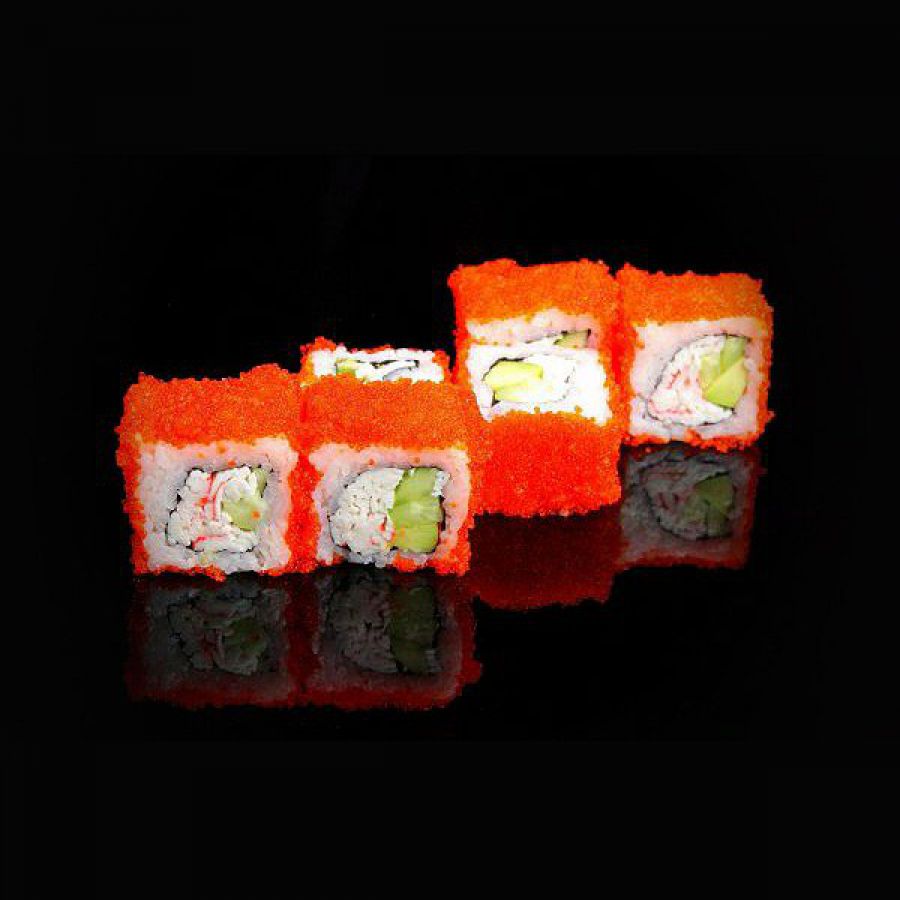 Калифорния с крабом «Tatami-sushi»Состав роллов: Рис, нори, огурец, авокадо, снежный краб, икра Тобико (Вес — 230г)цена : 235 грн доставка по Измаилу: 120 грн