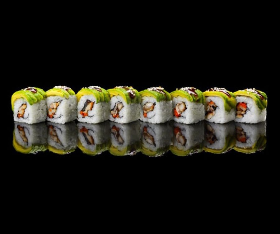 Роллы Зеленый Дракон «Tatami-sushi»Состав роллов: Рис, огурец, угорь, икра Тобико, авокадо, унаги соус, кунжут (Вес — 240г)цена : 285 грн доставка по Измаилу: 120 грн