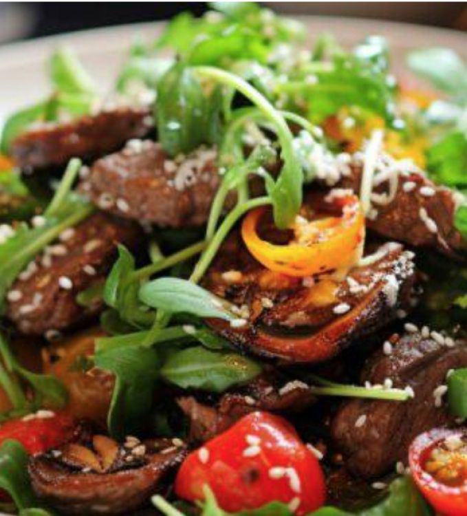 Теплий салат з телятини «Хуторок»пекінська кап., мікс салата, помідор св., баклажан, мандарин, соус, телятинацена : 250 грн доставка по Измаилу: 120 грн