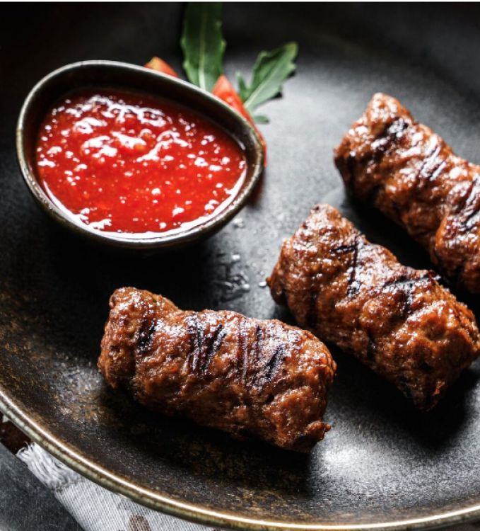 Мититеи з соусом аджика «Хуторок»М ясо телятини, спеціі, часник, соус, зелень.цена : 240 грн доставка по Измаилу: 120 грн