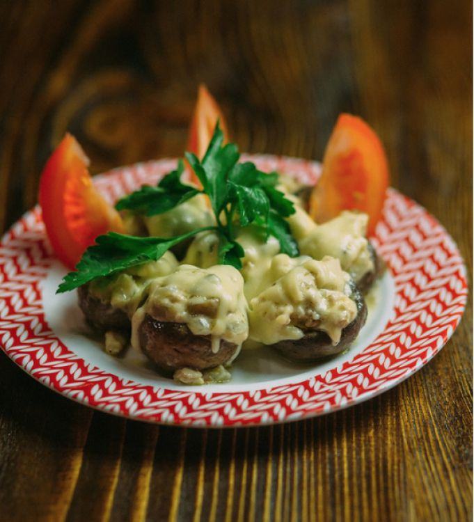 Грибна пательня «Хуторок»Капелюшки грибів фаршировані курячим філе, запечені з сиром .цена : 220 грн доставка по Измаилу: 120 грн