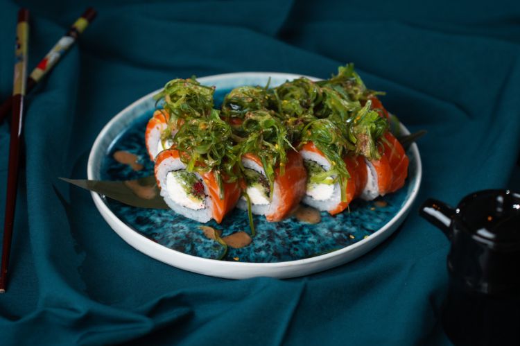 Мон Рол з лососем «Premium Sushi»рис, сир філадельфія, огірок, ікра масаго, лосось, чука, горіховий соус420g (8шт.)цена : 380 грн доставка по Измаилу: 120 грн