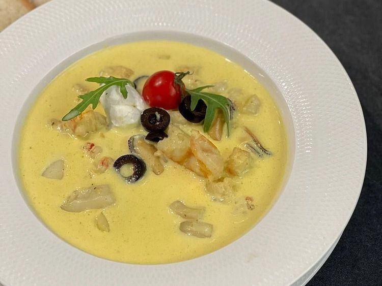 Вершковий суп із морепродуктами «КАФЕ BEREG»Креветка, кальмар, мідія, вершки , рибна юшка250гцена : 355 грн доставка по Измаилу: 120 грн