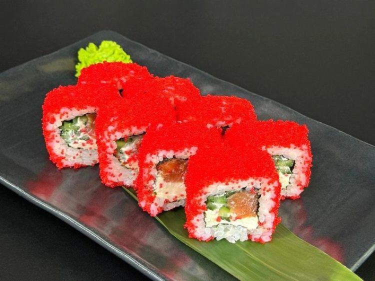 Каліфорнія з лососем «Дитяче Королівство»Рис, лосось, огірок, японський майонез, ікра Тобіко, крем-сир Філадельфія280гцена : 295 грн доставка по Измаилу: 120 грн