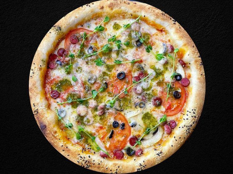 Піца Мисливська 50 см «Дитяче Королівство»Мисливськи ковбаски,печериці,маслини,помідор,сир моцарела,рукола,соус песто,соус томатнийцена : 435 грн доставка по Измаилу: 120 грн