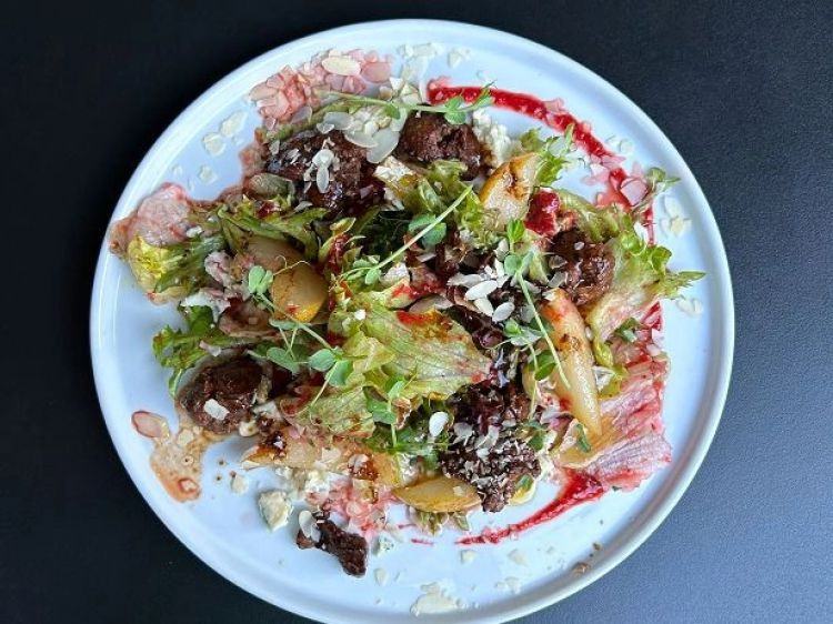 Салат Теплий з грушею «Дитяче Королівство»Груша, мікс салата, куряча печінка, сир Дор блю, помідори, апельсин, соус "Унагі"300гцена : 289 грн доставка по Измаилу: 120 грн