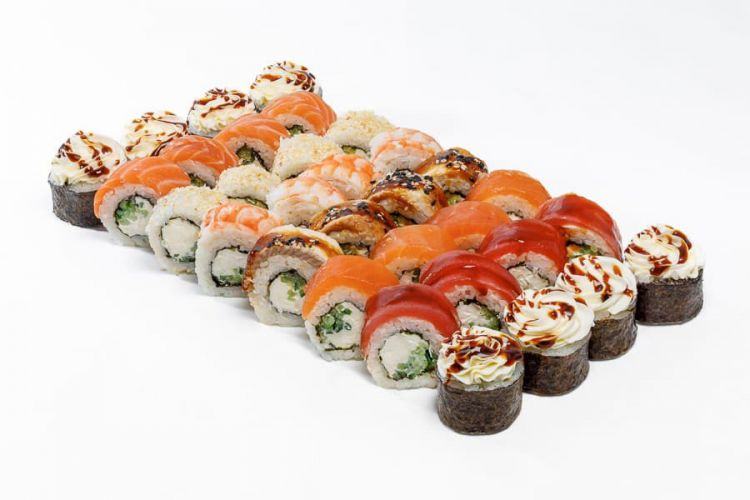 Сет Токіо «Osama Sushi»Вага: 1090 г Склад: філа з лососесм ½, філа з тунцем ½, філа з копч.лососем ½, філа з вугрем ½, філа з тигровою креветкою ½, філа сезам ½, рол хіко макцена : 592 грн доставка по Измаилу: 120 грн