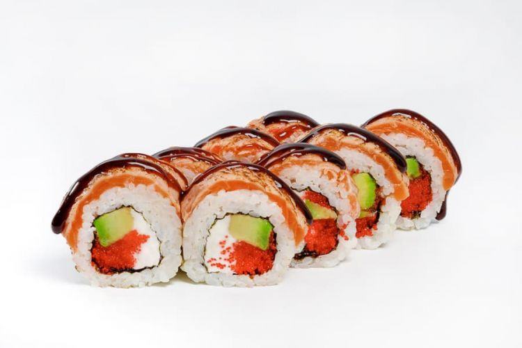 Гранд рол «Osama Sushi»Вага: 285 г Склад: норі, рис, лосось гриль, авокадо, унагі соус або шрірача (гострий соус), сир філадельфія, ікра тобікоцена : 216 грн доставка по Измаилу: 120 грн