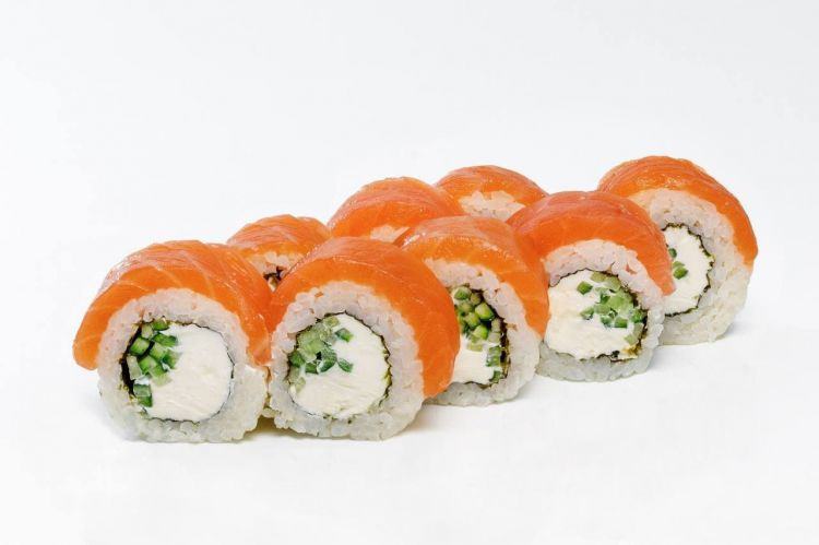 Філадельфія з копченим лососем «Osama Sushi»Вага: 270 г Склад: норі, рис, сир філа, огірок, копчений лососьцена : 177 грн доставка по Измаилу: 120 грн