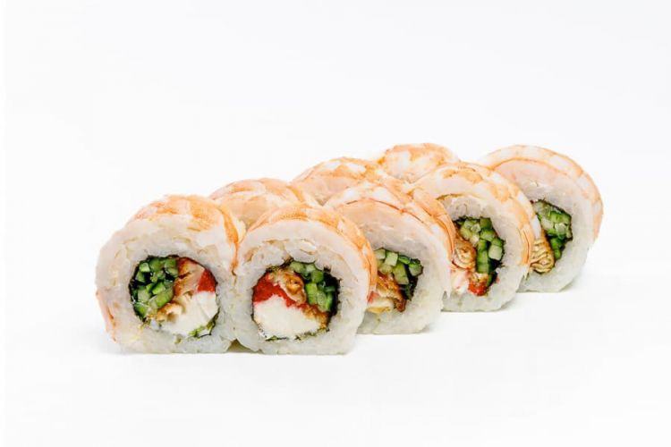 Дракон золотий «Osama Sushi»Вага: 255 г Склад: норі, рис, огірок, вугор, тобіко, сир філа, тигрова креветкацена : 188 грн доставка по Измаилу: 120 грн
