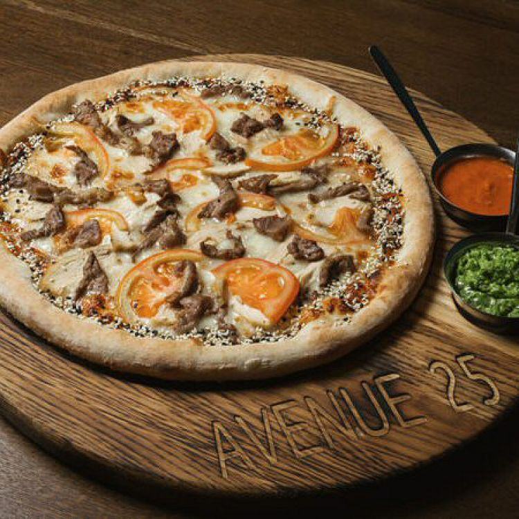 Пицца G.Q. «Avenue 25»Свинина, телятина, куриное филе, томаты, «Моцарелла», соус «B.B.Q.», микс кунжута. Вес 500г.цена : 390 грн доставка по Измаилу: 120 грн