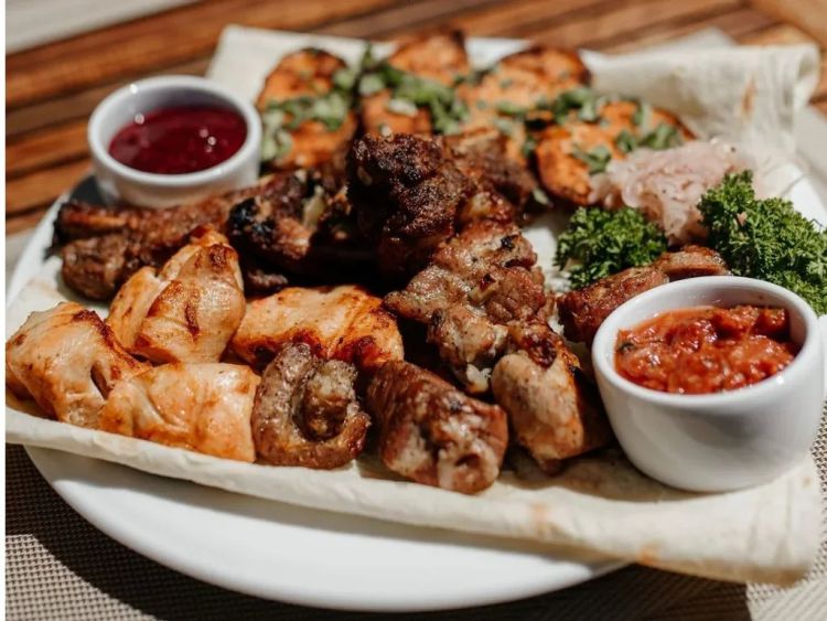 Тарілка з мангалу «Хінкальня»Шашлик зі свинини,шашлик з курячого філе,люля-кебаб із телятини,картопля з мангалу,соус сацебелі та ткемалі,цибуля та зелень1000* г(вага сирої страви)цена : 695 грн доставка по Измаилу: 120 грн