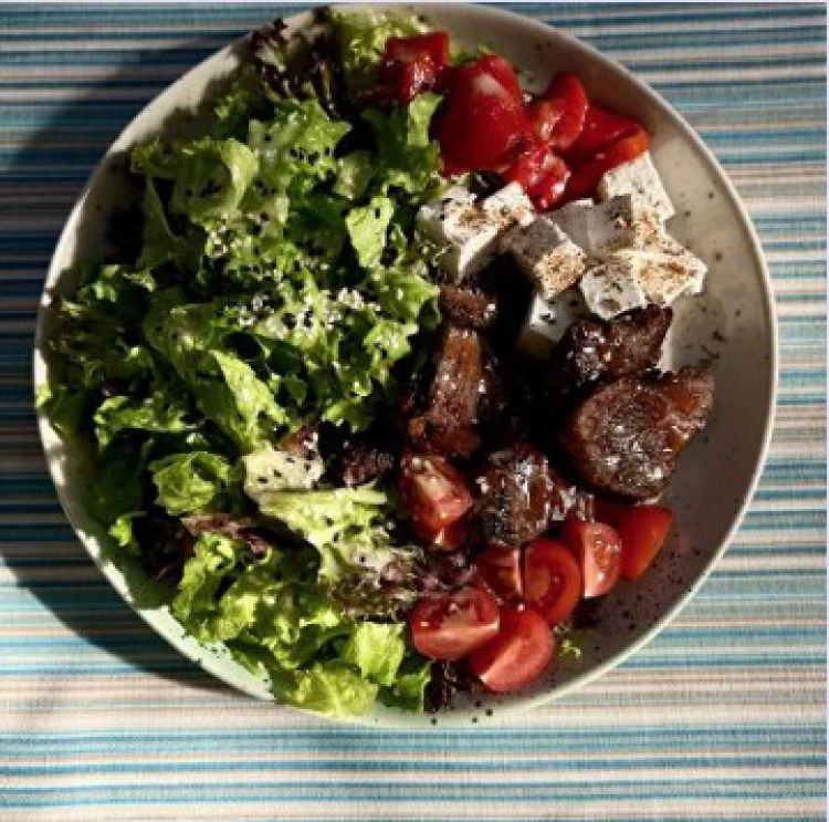 Теплий салат із телятиною «Пані-Піца»Мікс листів, телятина-гриль, печений перець, чері, вершковий сирЗаправляється дресингом370 грамцена : 340 грн доставка по Измаилу: 120 грн
