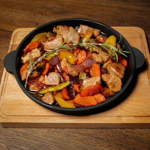 Горячая сковорода со свининой «Avenue 25»Свиное филе, сладкий перец, красный лук, морковь, шампиньоны, кабачок, фирменный кисло-сладкий соус «Хонг», микс кунжута. Вес 300г.цена : 400 грн доставка по Измаилу: 120 грн