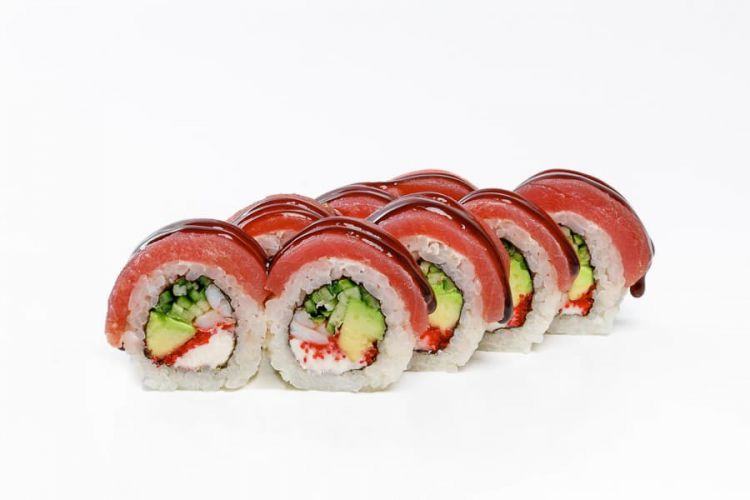 Червоний дракон «Osama Sushi»Вага: 270 г Склад: норі, рис, огірок, тигрова креветка, сир філа, авокадо, тунець, унагі соус, ікра тобікоцена : 184 грн доставка по Измаилу: 120 грн