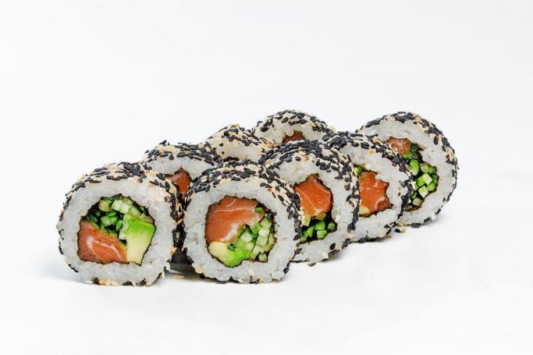 Каліфорнія з лососем в кунжуті «Osama Sushi»Вага: 255 г Склад: норі, рис, лосось філе, авокадо, огірок, японський м., кунжутцена : 123 грн доставка по Измаилу: 120 грн