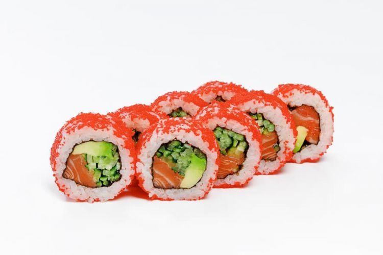 Каліфорнія з лососем в ікрі «Osama Sushi»Вага: 255 г Склад: норі, рис, огірок, авокадо, тобіко (зверху), лосось філе, японський м.цена : 170 грн доставка по Измаилу: 120 грн