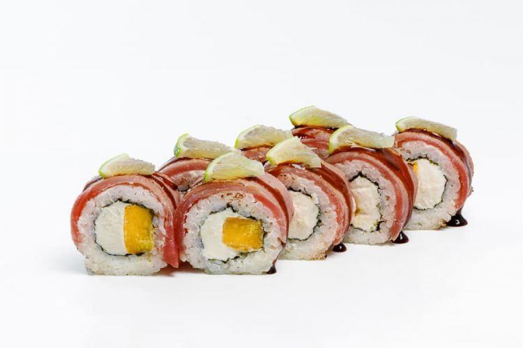 Авторський «Гриль рол» «Osama Sushi»Вага: 295 г Склад: Норі, Рис, Тунець гриль, Манго, Сир філа, Лайм , Унагіцена : 197 грн доставка по Измаилу: 120 грн