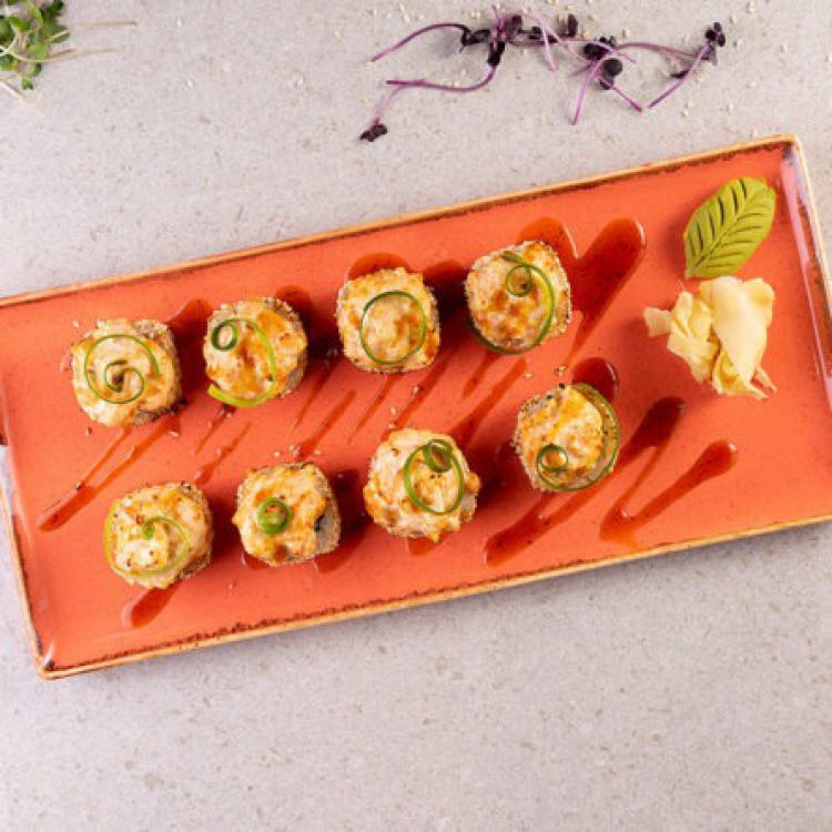РОЛ ЗАПЕЧЕНИЙ З ЛОСОСЕМ «Celentano»Рис нішикі, норі, креветка темпура, лосось, сир філадельфія, соус унагі, кунжут 275 гцена : 315 грн доставка по Измаилу: 120 грн