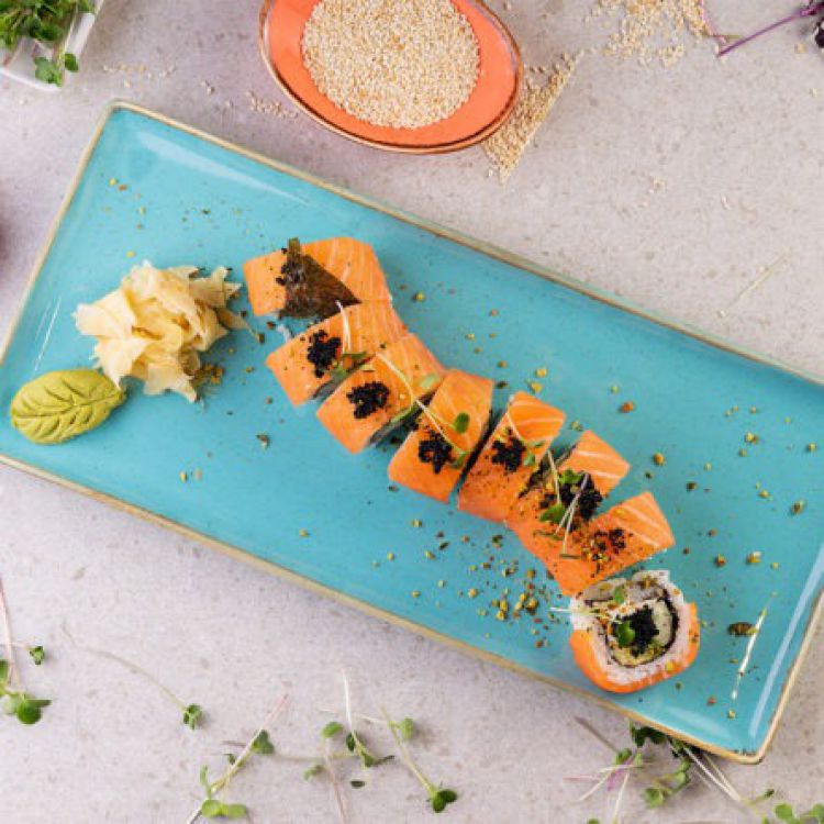 РОЛ ФІЛАДЕЛЬФІЯ З ЛОСОСЕМ «Celentano»Рис нішикі, норі, лосось, авокадо, огірок, сир Філадельфія, ікра тобіко чорна 290гцена : 285 грн доставка по Измаилу: 120 грн