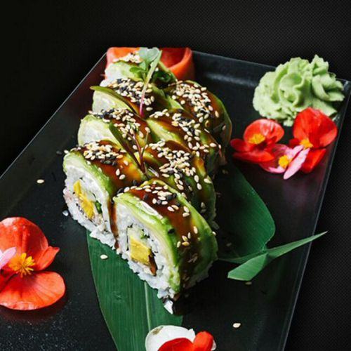 Ролл Зеленый дракон «Avenue 25»Сливочный сыр, японский омлет, копченый угорь, авокадо, соус «Унаги», микс кунжута. Вес 220г.цена : 350 грн доставка по Измаилу: 120 грн