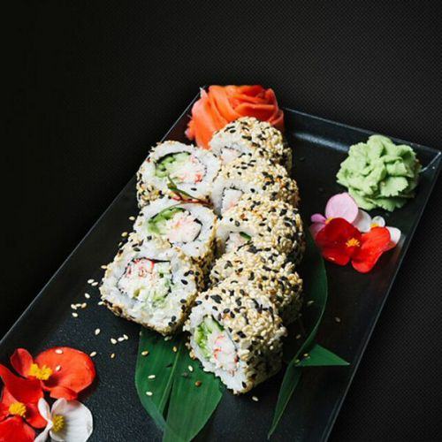 Ролл Калифорния в кунжуте «Avenue 25»Японский майонез, «Снежный краб», свежие огурец, микс кунжута. Вес 220г.цена : 380 грн доставка по Измаилу: 120 грн