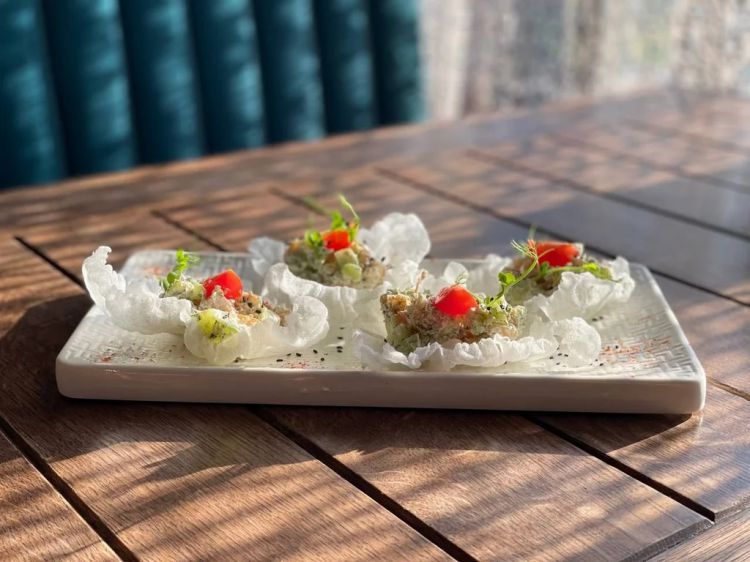Морська перлина з креветкою «CheBurek»Рисові чіпси, огірок, вершковий сир, кріп, смажена креветка, кунжут, чері.цена : 447 грн доставка по Измаилу: 120 грн