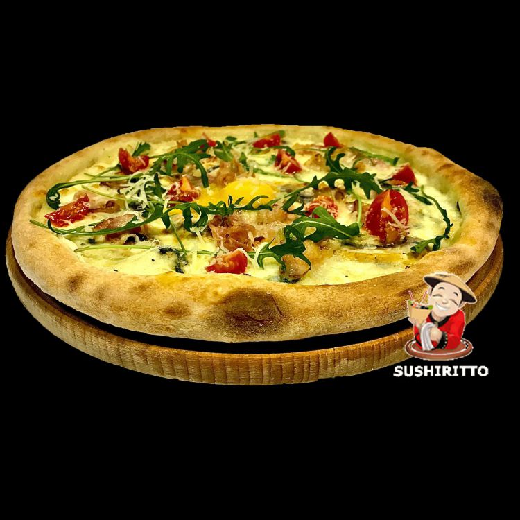 Карбонара «SushiRitto»Соус білий, моцарелла, бекон, печериці, помідор черрі, рукола, пармезан, яйце (жовток).цена : 300 грн доставка по Измаилу: 120 грн