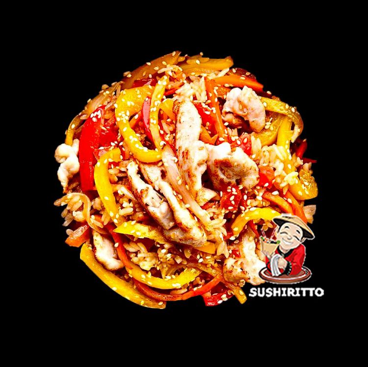 «SushiRitto»Тайський рис з обсмаженою свининою у фірмовому тайському соусі з додаванням: брюсельска капуста, гриб шитаке, часникового соусу, моркви, болгарського перцю, зеленої цибулі, кунжуту.Вага: 370 гр.