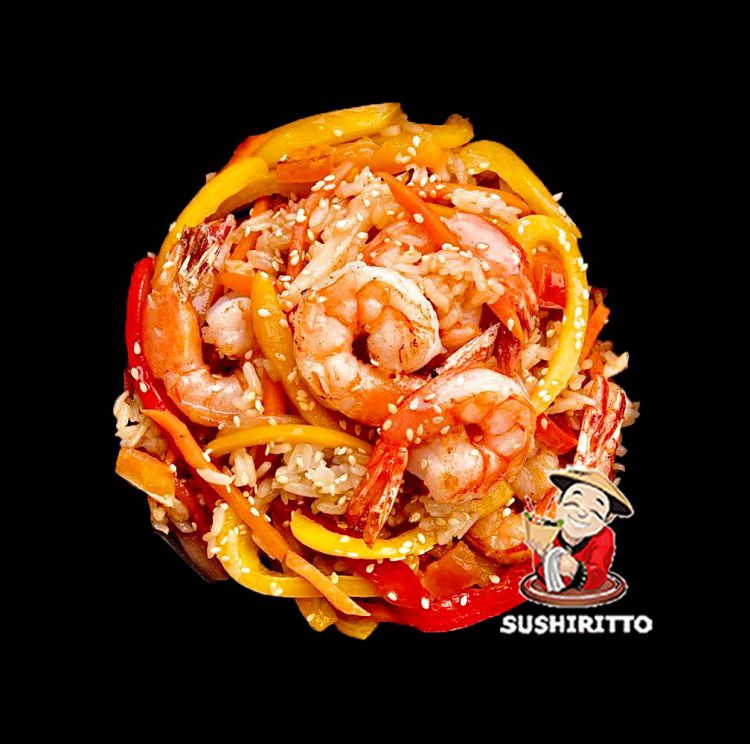 «SushiRitto»Тайський рис з обсмаженими тигровими креветками у фірмовому соусі з додаванням: брюсельска капуста, гриб шитаке, часникового соусу, моркви, болгарського перцю, зеленої цибулі, кунжуту.