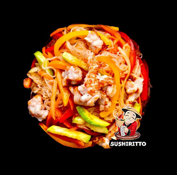 «SushiRitto»Скляна локшина з обсмаженою куркою у фірмовому тайському соусі з овочами: болгарський перець, цибуля, морква бейбі, кунжут, цибуля зелена, брюсельска капуста, гриб шитаке.Вага: 370 гр.