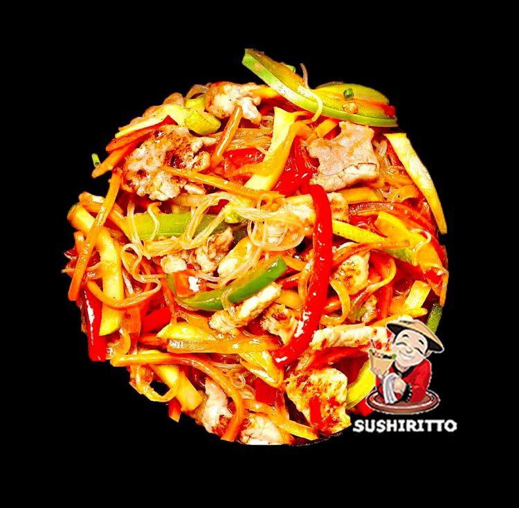 «SushiRitto»Скляна локшина з обсмаженою свининою у фірмовому тайському соусі, ніжно обсмаженими овочами: болгарський перець, цибуля, морква бейбі, кунжут, цибуля зелена, брюсельска капуста, гриб шитаке.