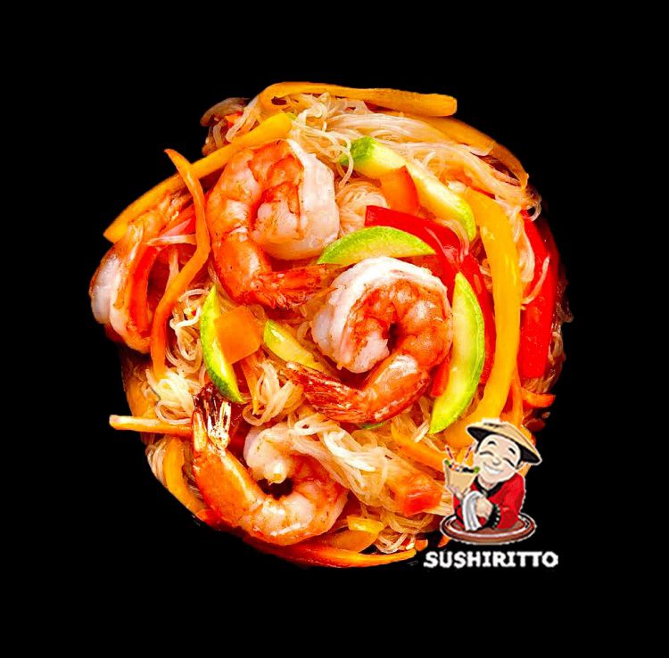 «SushiRitto»Скляна локшина з обсмаженими тигровими креветками у фірмовому тайському соусі з овочами: болгарський перець, цибуля, морква бейбі, кунжут, цибуля зелена, брюсельска капуста, гриб шитаке. Вага: 320 гр.