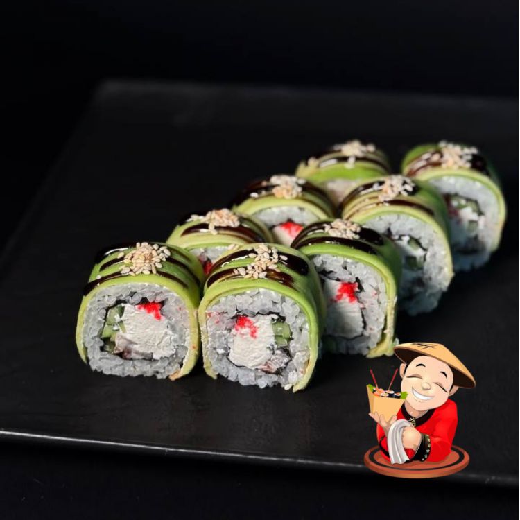 Зелений дракон «SushiRitto»Вугор копчений, огірок, ікра летючої риби, вершковий сир, кунжут, накритий рол авокадо та полит Унагі соусом220 гр.цена : 290 грн доставка по Измаилу: 120 грн
