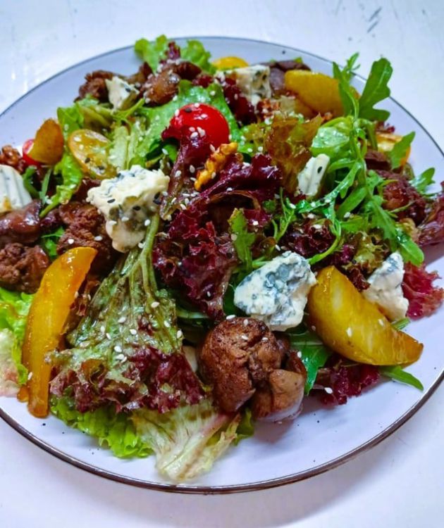 Салат з курячої печінки «Zeytun»Поєднання ніжності курячої печінки та груші з медовим соусом, сиром дор-блю та волоським горіхом (360 гр)цена : 350 грн доставка по Измаилу: 120 грн