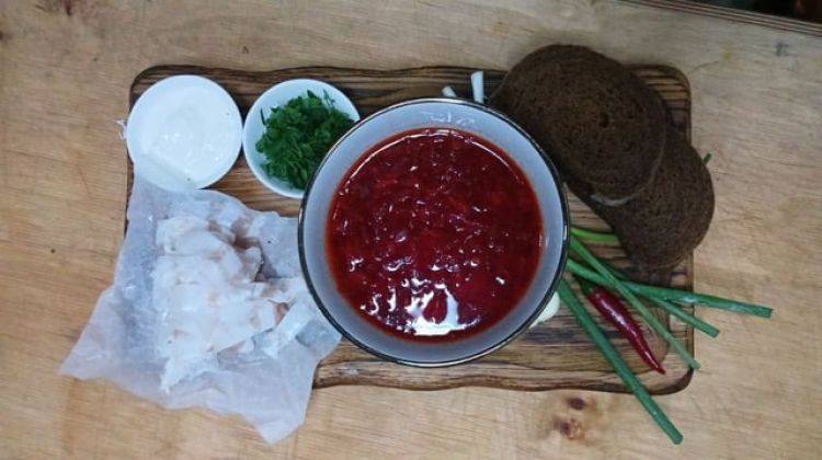 Борщ з салом «Zeytun»Телятина ,картопля ,буряк ,морква ,капуста ,томат.Подається зі сметаной та салом.(350/40 гр)цена : 290 грн доставка по Измаилу: 120 грн